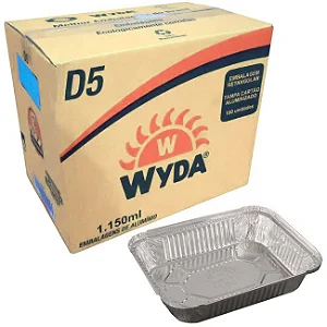 Bandeja de alumínio Wyda Prática 1150 ml CJD5 ideal para marmitas e refeições prontas. Resistente, prática e descartável. Caixa com 200 unidades ou pacote com 10 unidades.